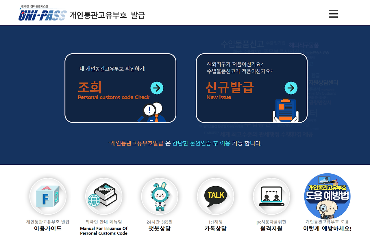 - 홈페이지 상단 메뉴에서 ‘개인통관고유부호 발급’ 버튼을 클릭합니다.