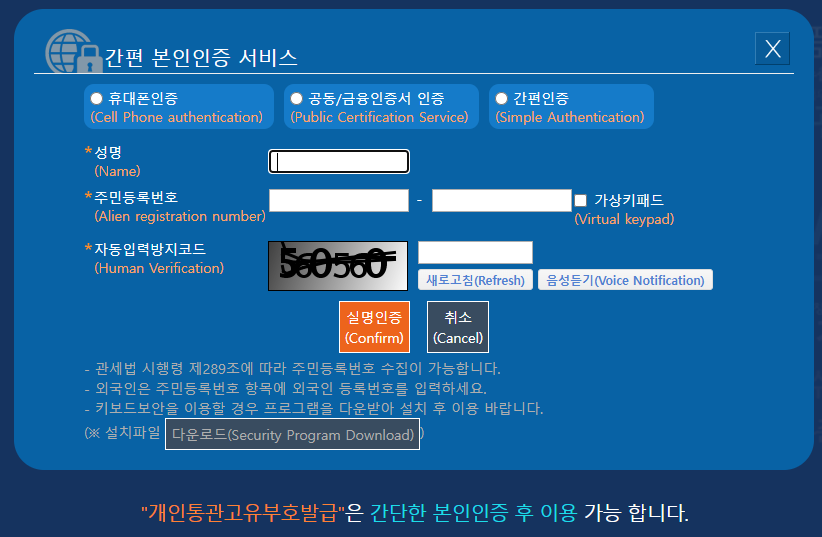 - 본인 인증을 완료합니다. 인증 방식은 휴대폰 인증, 공동 인증서 등 다양하게 지원됩니다.