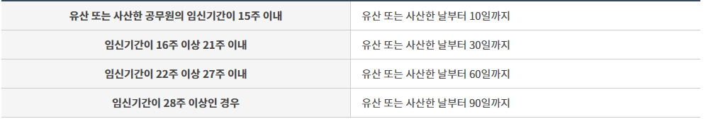 임신 중 유산 또는 사산 시에 휴가는 다음과 같습니다.