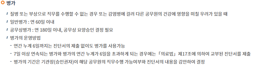 - 병가를 모두 사용한 후에도 직무를 수행할 수 없거나 계속 요양을 할 필요성이 있는 경우