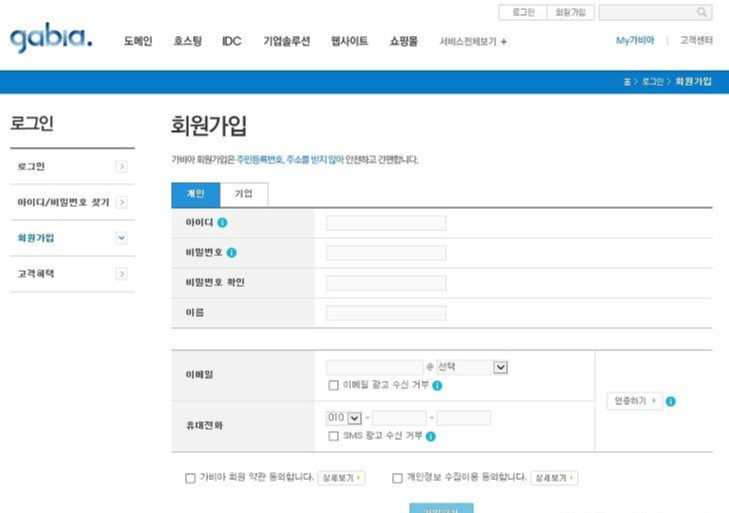 일단 가비아의 홈페이지에 접속해서 회원가입을 해야 한다.