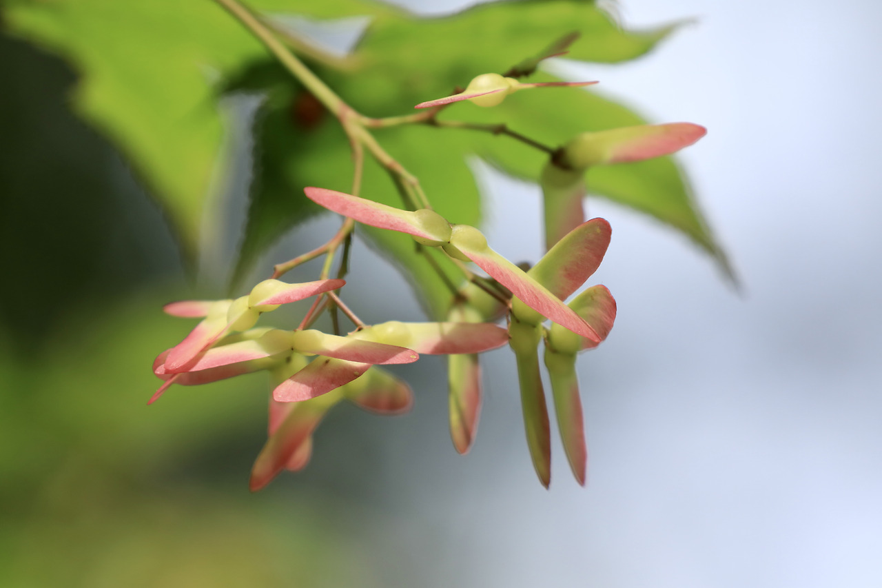 알게 모르게 꽃이 피고, 특이한 열매가 열립니다. 단풍나무의 열매는 가을이 깊어지면 말라서 무게가 가벼워집니다. 바람이 불면 가지에서 떨어져 나와 헬리콥터처럼 바람에 날개가 빙글빙글 돌면서 낙하하면서 비행이 가능합니다.