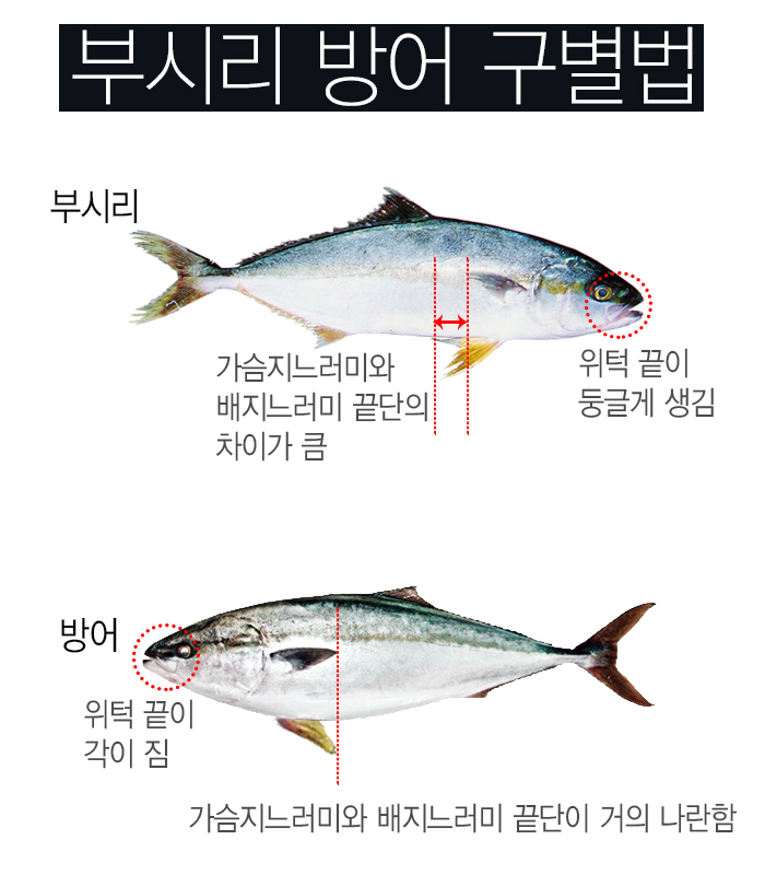 그렇다면 어떻게 방어와 부시리를 구분할 수 있을까요? 먼저 외형에서 찾아볼 수 있는 차이점을 살펴보겠습니다.