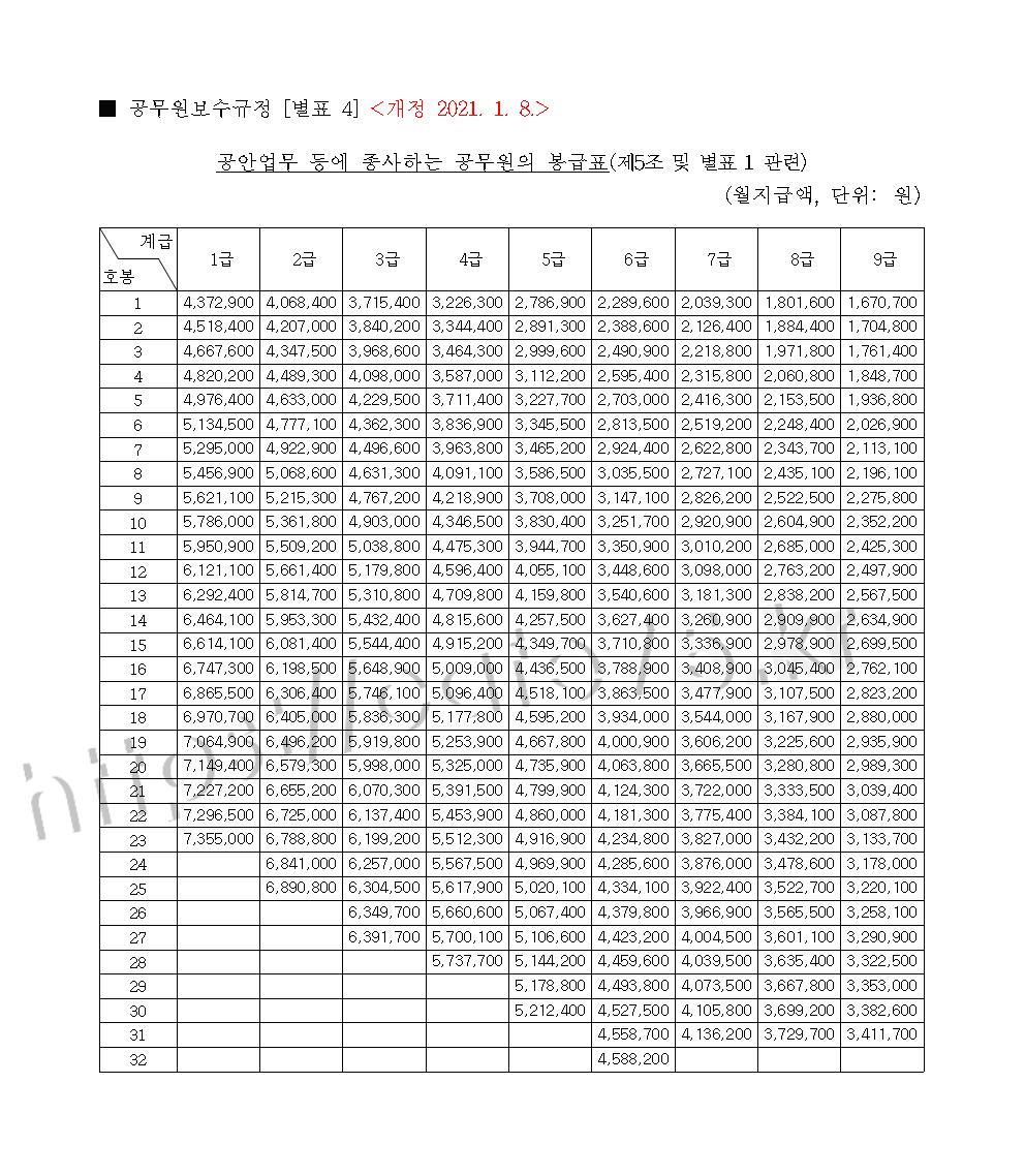 참고로 2020년 공안직 공무원 봉급표와 2021 공안직 공무원 봉급표 예상표를 올려 둔다.