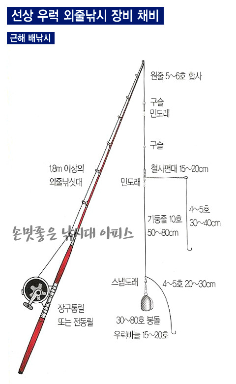 키워드: 선상 우럭 외줄낚시, 채비, 낚싯대, 릴, 라인, 바늘, 봉돌, 미끼, 조피볼락, 낚시 장비