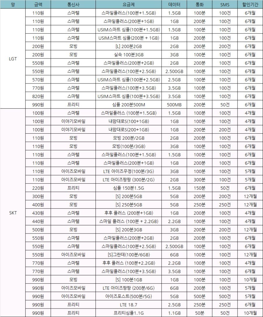 - 최저 요금제: [LGT망] 프리티 데이터안심 15G(신한카드)+ 요금제