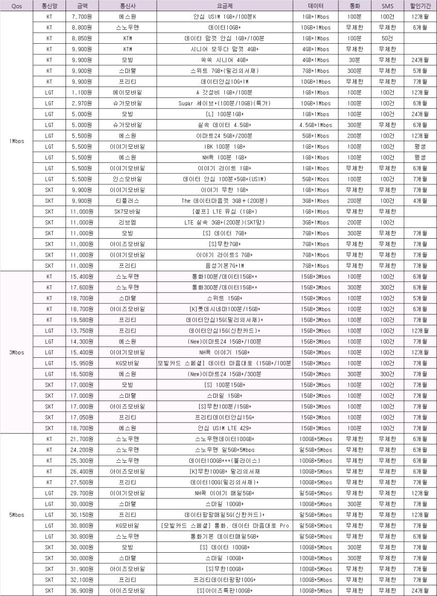 - 데이터: 1GB + 1 Mbps