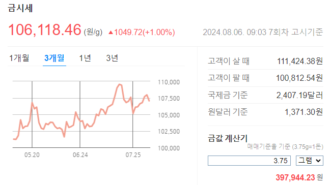 | 순금 (24K) 금 1돈 가격 | 399,000원 | 454,000원 | 1,000원 상승 |