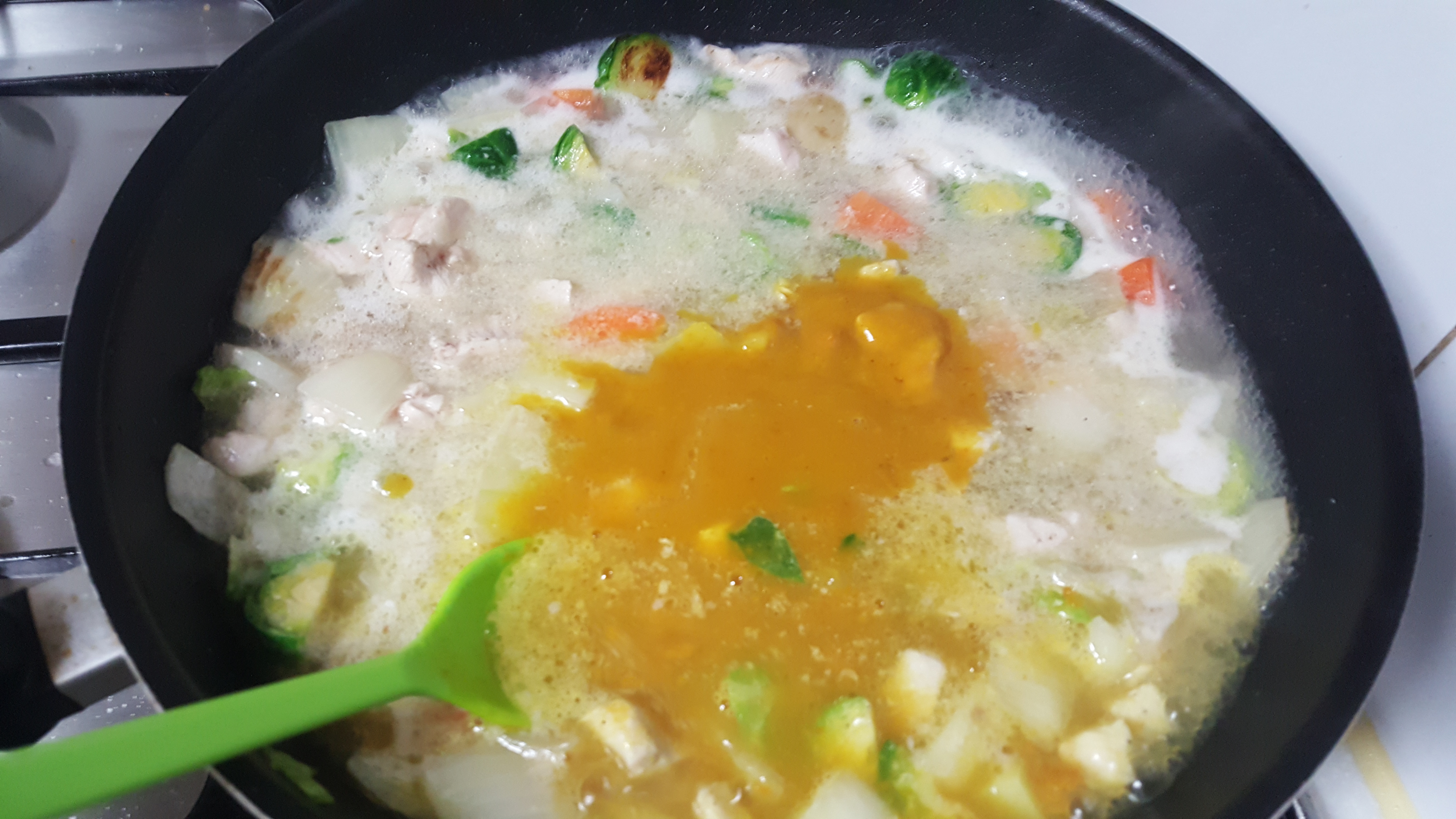 - 오뚜기 순한맛 카레 100g을 넣고 잘 저어줍니다. 카레 가루가 잘 풀리도록 천천히 저어주며 끓여줍니다.