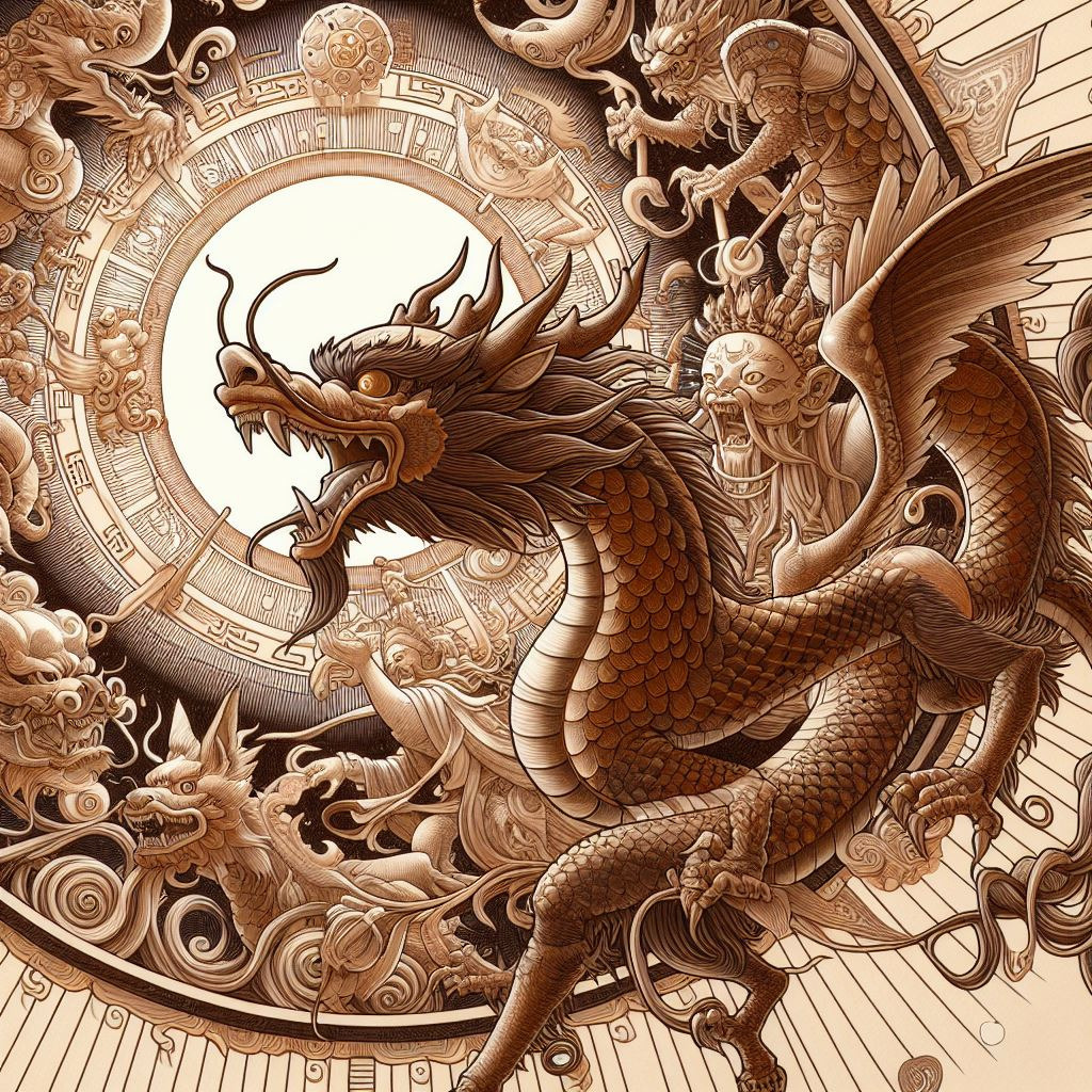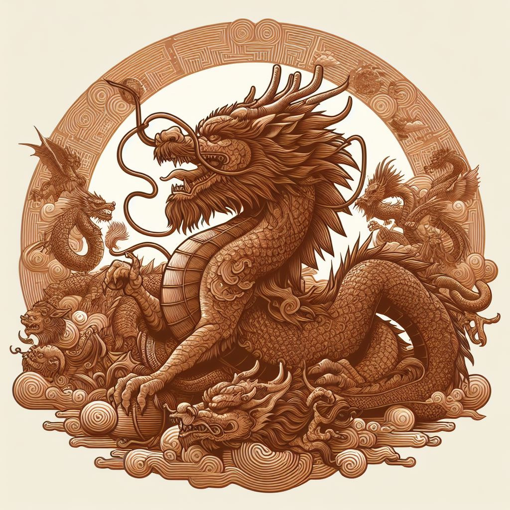 • 용 (辰): '진(辰)'은 신비로움과 번영의 상징인 용을 나타냅니다. 중국 문화에서 용은 황제의 상징이자 강력한 신성한 존재로, 하늘과 물, 땅을 다스린다고 여겨집니다. 용의 상징성은 강력한 통치자와 자연의 힘을 통제하려는 인간의 열망을 나타냅니다.