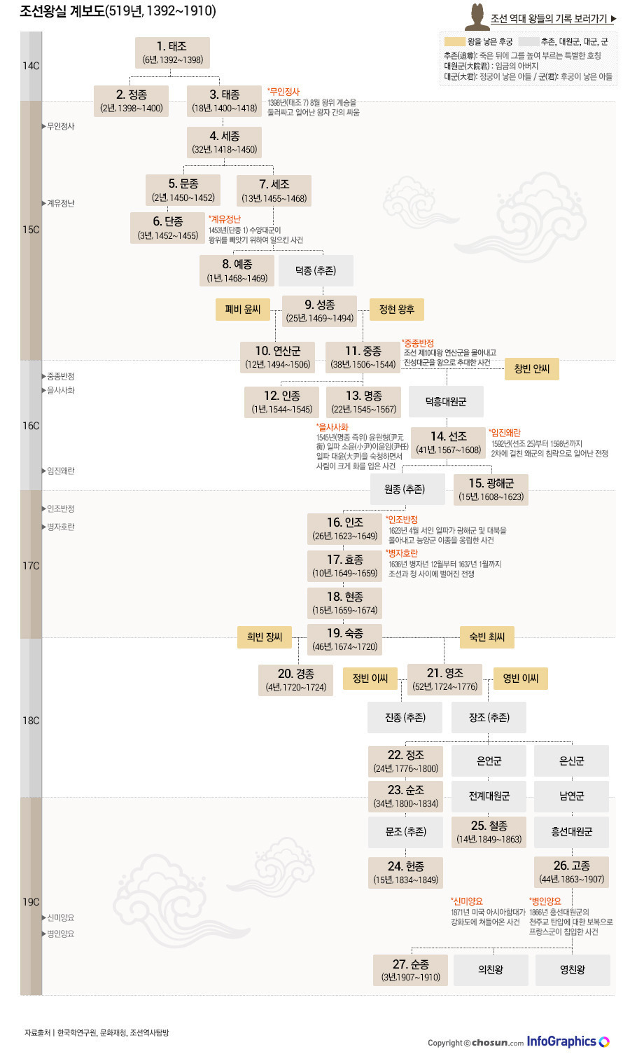 조선왕조 계보 외우기, 가계도, 왕이름: 장대한 역사 속 왕실의 흐름