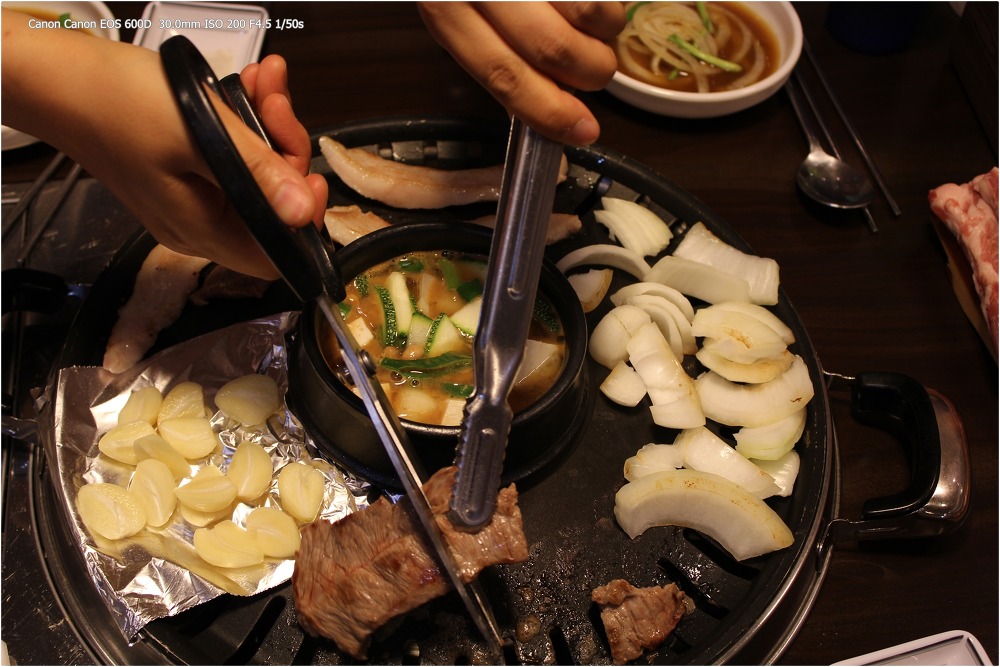 목살의 지방과 삼겹살의 지방이 절제되어 있다. 불판의 기름이 좔좔 잘 빠지는 구조라면 술 없이 고기만 먹어도 딱이겠지만, 역시 삼겹살은 소주와 함께 먹어야 하는 것! 술 없이 삼겹살만 먹기에는 원래 느끼한 법. 내가 술을 못 마실 뿐이지, 맛도 모르는 건 아니니까 ㅜㅜ