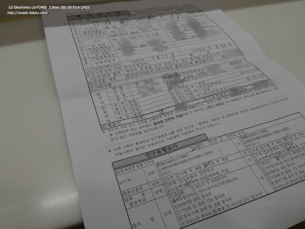 혼인신고서 양식을 작성하는 것도 처음이지만, 재혼으로 혼인신고서 양식을 작성하는 것도 처음인지라... 모든 게 조심스럽더군요.