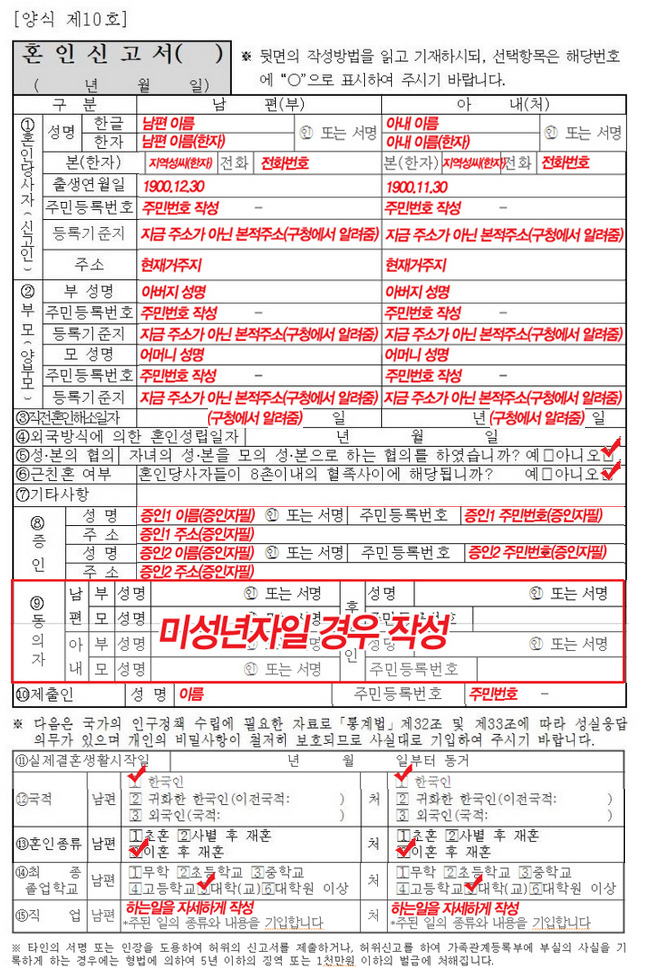 위의 혼인신고서 작성양식은 초혼의 경우의 양식이에요. 우리나라는 미성년자의 혼인이 완전히 금지되어 있지는 않기 때문에, 간혹 미성년자가 혼인을 하려는 경우에는 부모의 동의를 얻어야 합니다.