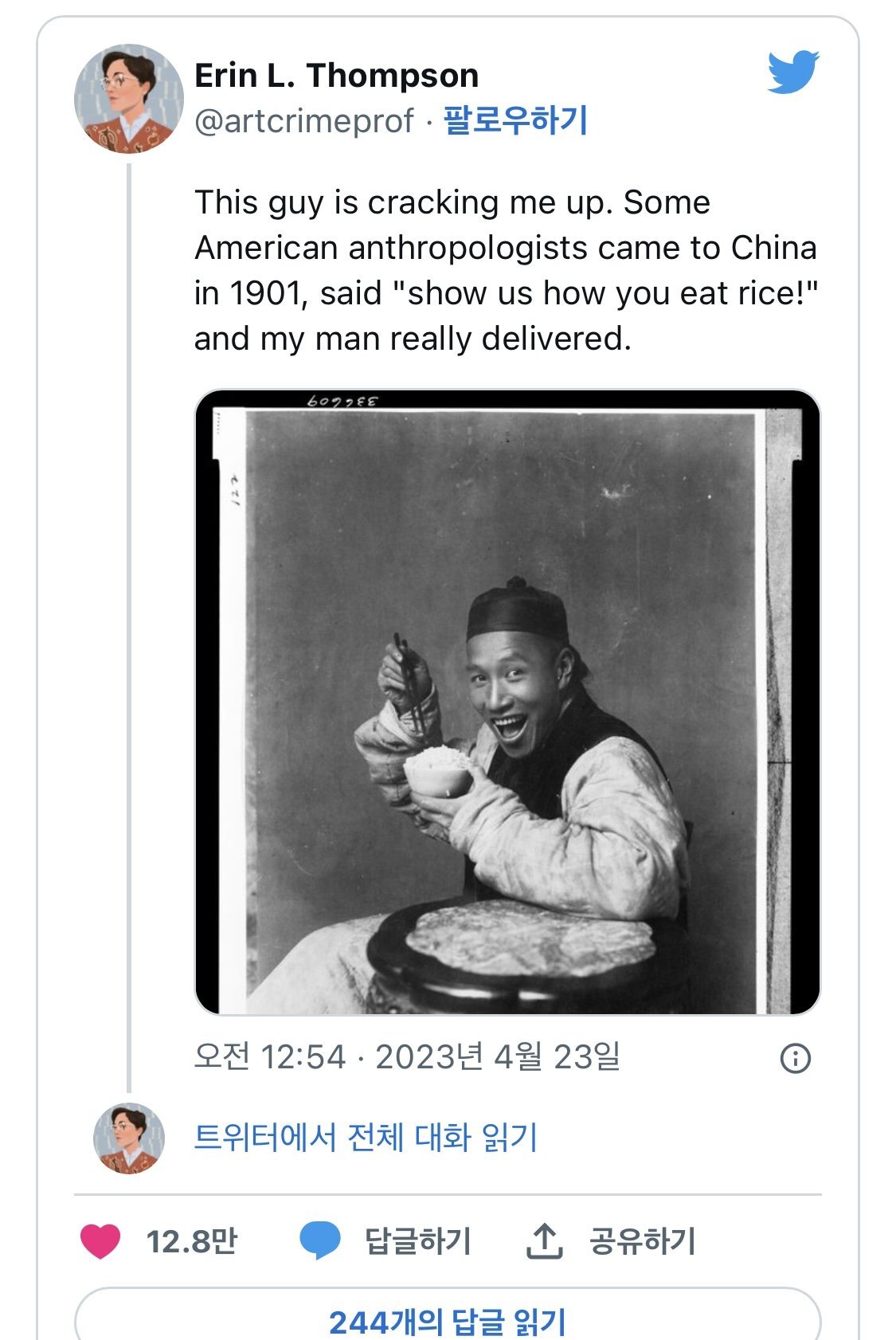 1901년에 찍힌 이 밥 먹는 남자 사진은 현대적인 감성과 힙한 포즈, 그리고 놀라운 화질로 인해 세월을 뛰어넘는 특별한 사진입니다. 당시의 사진 문화와 문명의 차이가 이 사진을 독창적이고 흥미롭게 만들었으며, 현대 사진 컨셉과도 닮아있어서 더욱 독특한 매력을 띄고 있습니다. 이러한 사진들을 통해 역사와 문화의 다양성을 이해하고 존중하는 것이 중요하며, 이러한 흥미로운 사진들을 더 많이 발견하고 공유하는 것은 우리의 시각을 더욱 넓혀줄 것입니다.