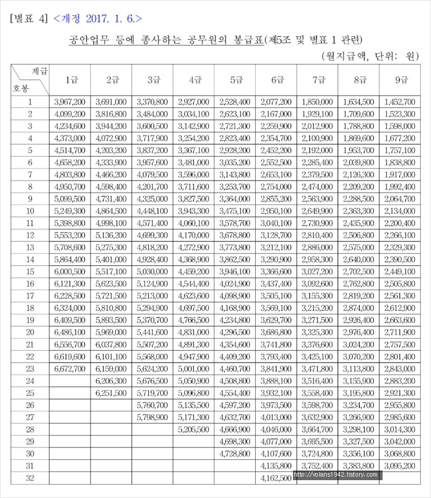이 들의 월급표는 위에 첨부된 표처럼 공안직 공무원 봉급표를 참조.