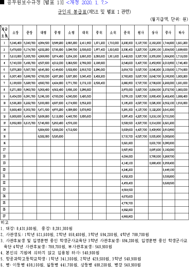 2020년 군인 봉급표 2020 공무원 월급