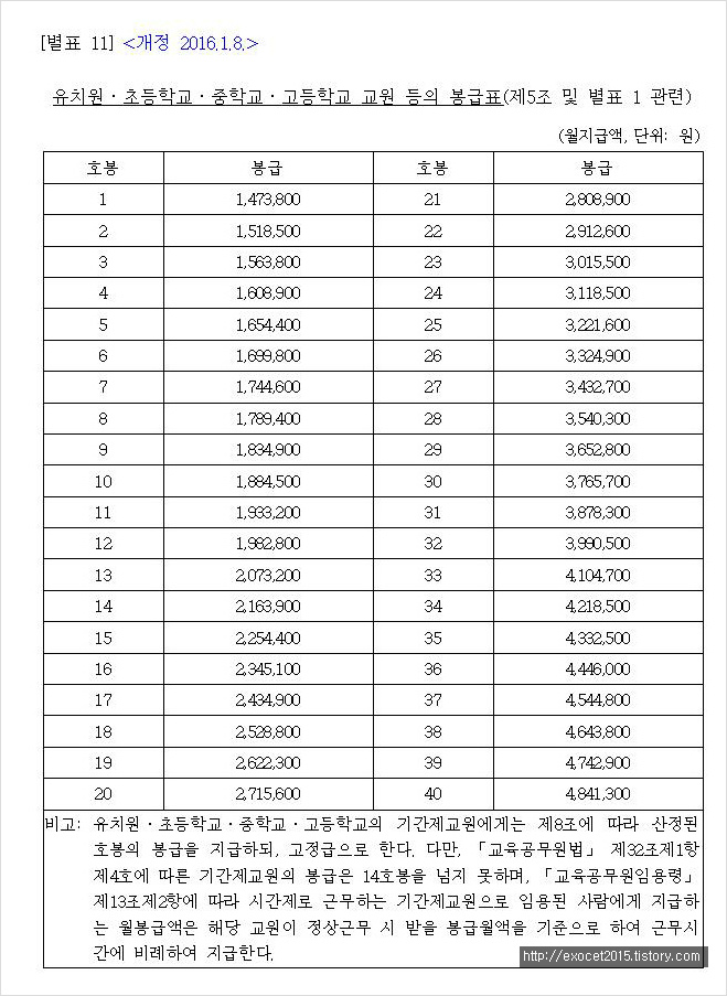 참고용 교육공무원 봉급표 2016 /유치원, 초등학교, 중학교, 고등학교 교원, 교사 월급