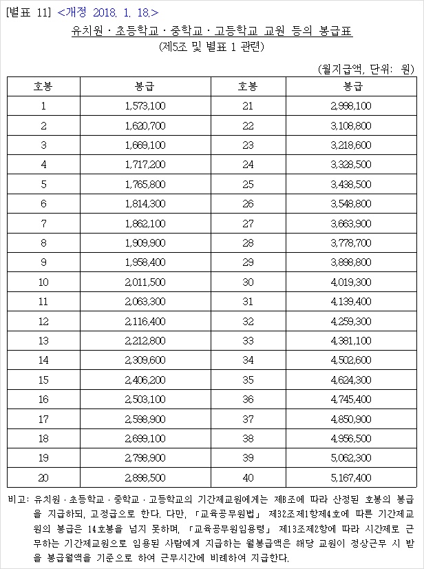 일반직 공무원들의 봉급표는 직급과 호봉에 따라 봉급표가 작성되지만, 유치원, 초등학교, 중학교, 고등학교 교원 등의 교육공무원 봉급표는 그냥 단순히 호봉으로만 봉급표가 작성되어 일종의 교원 2021 교사 보수표가 되죠.