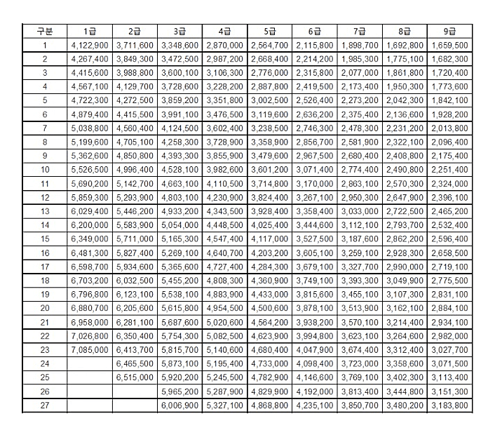 급수인 9급에 따라 나뉘어 있고, 각 계급의 호봉별로 정리가 되어 있습니다.